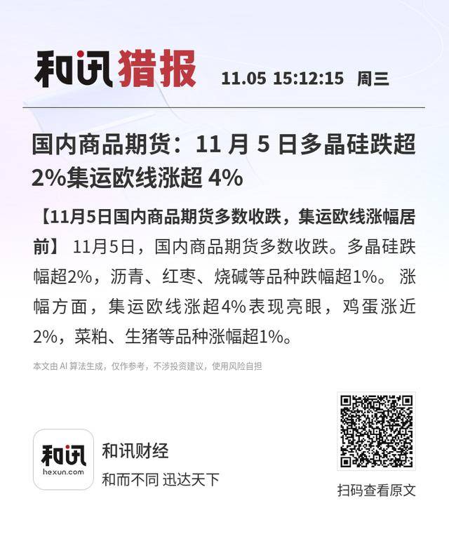 【11月5日国内商品期货多数收跌,集运欧线涨幅居前】11月5日,国内商品期货多数收跌。多晶硅跌幅超2%,沥青、红枣、烧碱等品种跌幅超1%。 涨幅方面,集运欧线涨超4%表现亮眼,鸡蛋涨近2%,菜粕、生猪等品种涨幅超1%。