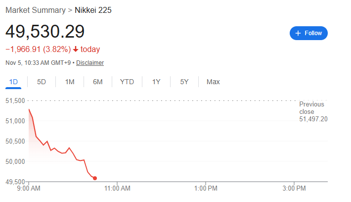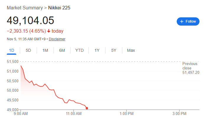 日经225指数跌幅持续扩大,截至发稿跌4.65%。