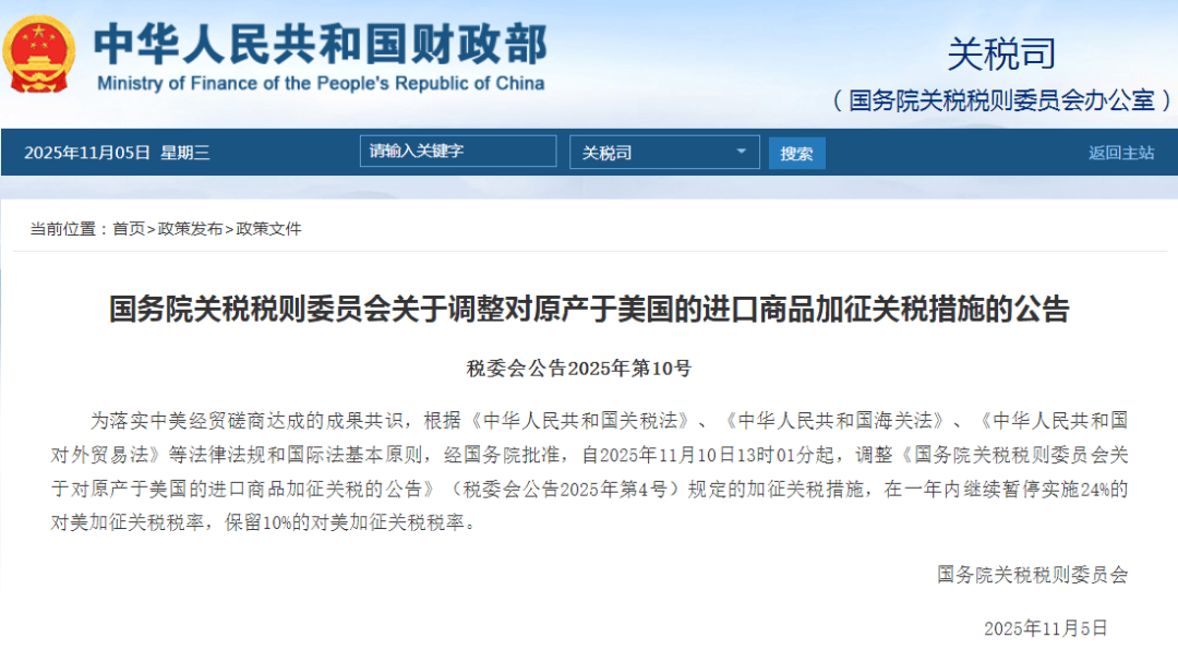 同时,自2025年11月10日13时01分起,调整《国务院关税税则委员会关于对原产于美国的进口商品加征关税的公告》(税委会公告2025年第4号)规定的加征关税措施,在一年内继续暂停实施24%的对美加征关税税率,保留10%的对美加征关税税率。