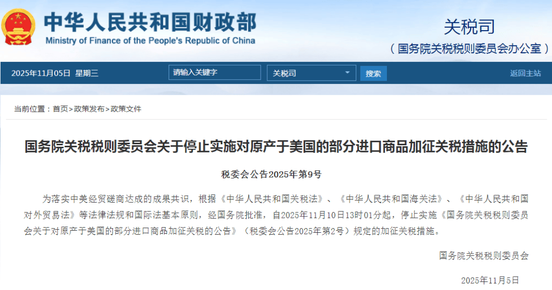 公告称,为落实中美经贸磋商达成的成果共识,根据《中华人民共和国关税法》《中华人民共和国海关法》《中华人民共和国对外贸易法》等法律法规和国际法基本原则,经国务院批准,自2025年11月10日13时01分起,停止实施《国务院关税税则委员会关于对原产于美国的部分进口商品加征关税的公告》(税委会公告2025年第2号)规定的加征关税措施。
