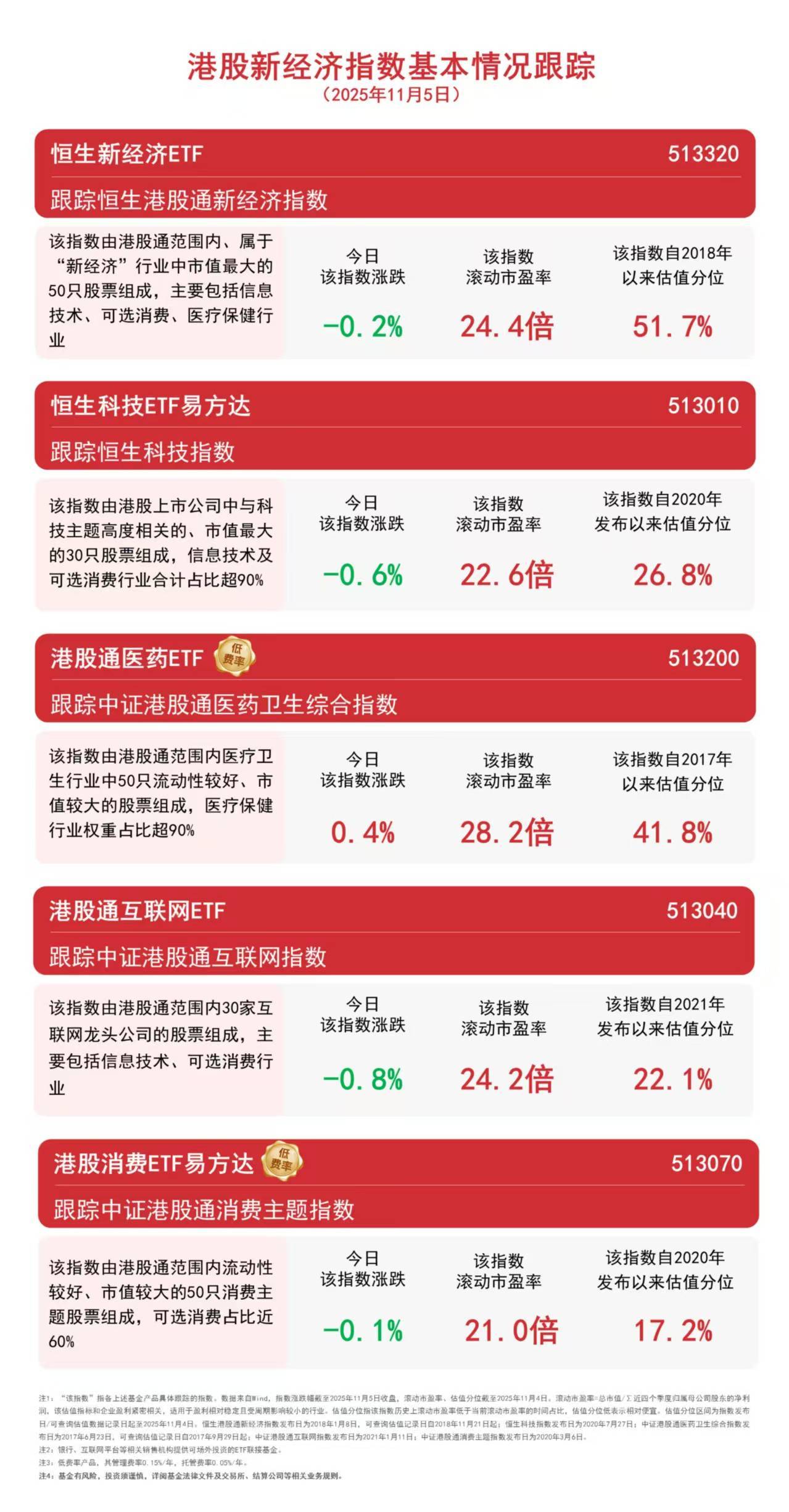 今日港股走势分化,科技股整体回调,医药股局部活跃,南向资金全天净买入超100亿港元。截至收盘,中证港股通医药卫生综合指数上涨0.4%,中证港股通消费主题指数下跌0.1%,恒生港股通新经济指数下跌0.2%,恒生科技指数下跌0.6%,中证港股通互联网指数下跌0.8%。资金借道ETF“越跌越买”,Wind数据显示,截至昨日,恒生科技ETF易方达(513010)、港股通互联网ETF(513040)均连续4个交易日获净流入,分别合计约6亿元和2亿元。
