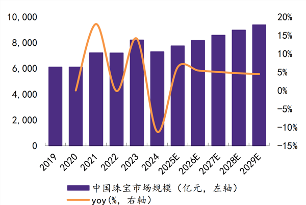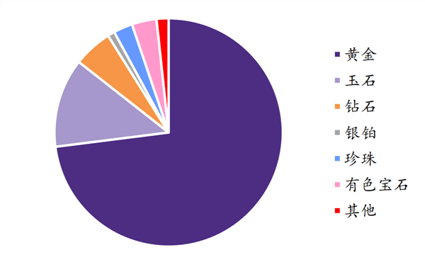 据中国珠宝玉石首饰行业协会数据,中国珠宝市场规模已从2019年的6100亿元稳步增长至2024年的7820亿元。在数字零售普及与“悦己”消费兴起的双重驱动下,预计到2029年,这一规模或将进一步提升至约9370亿元。值得注意的是,黄金品类在珠宝市场中占据绝对主导地位,其在2024年零售总额中的占比高达73%,显著高于其他材质。