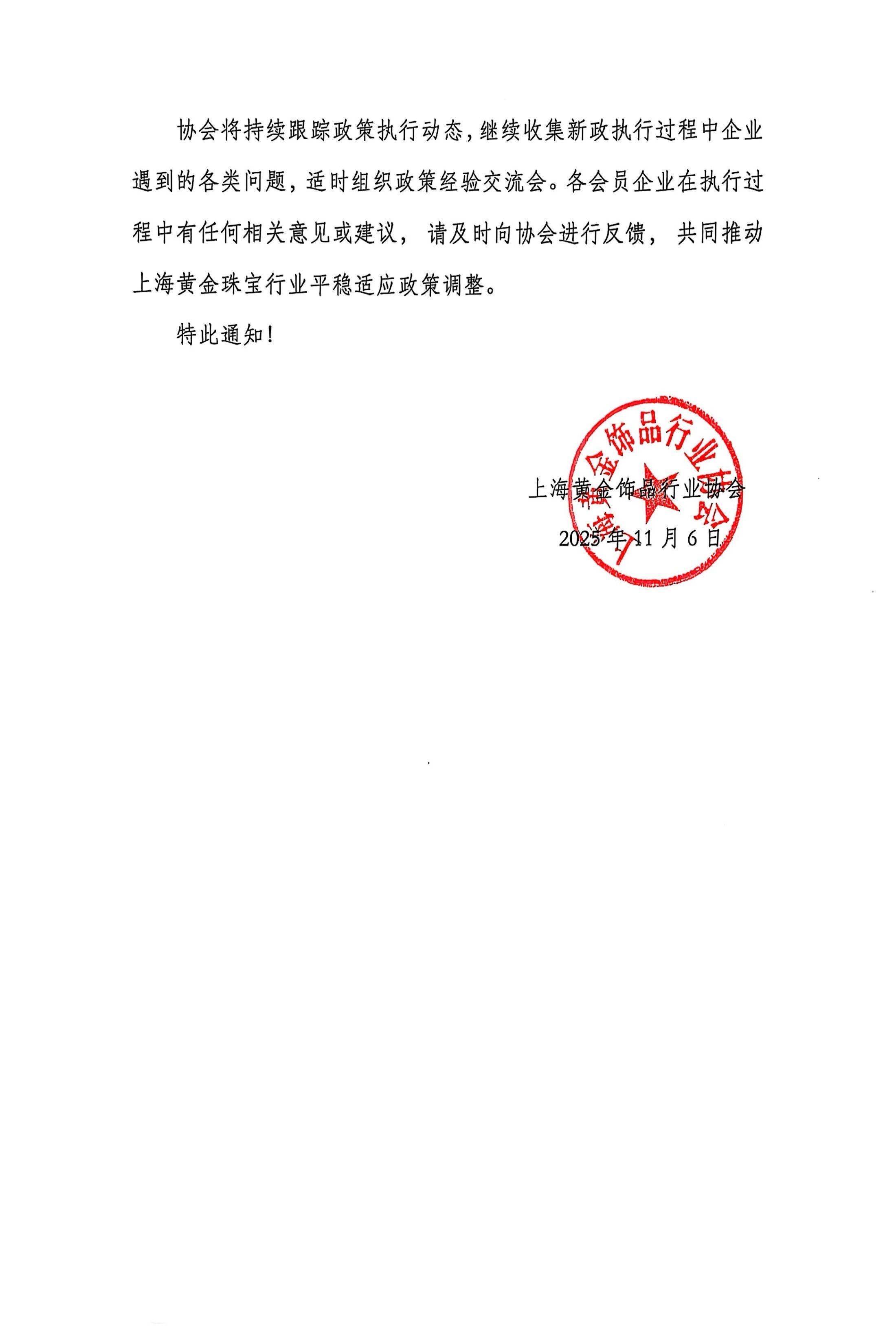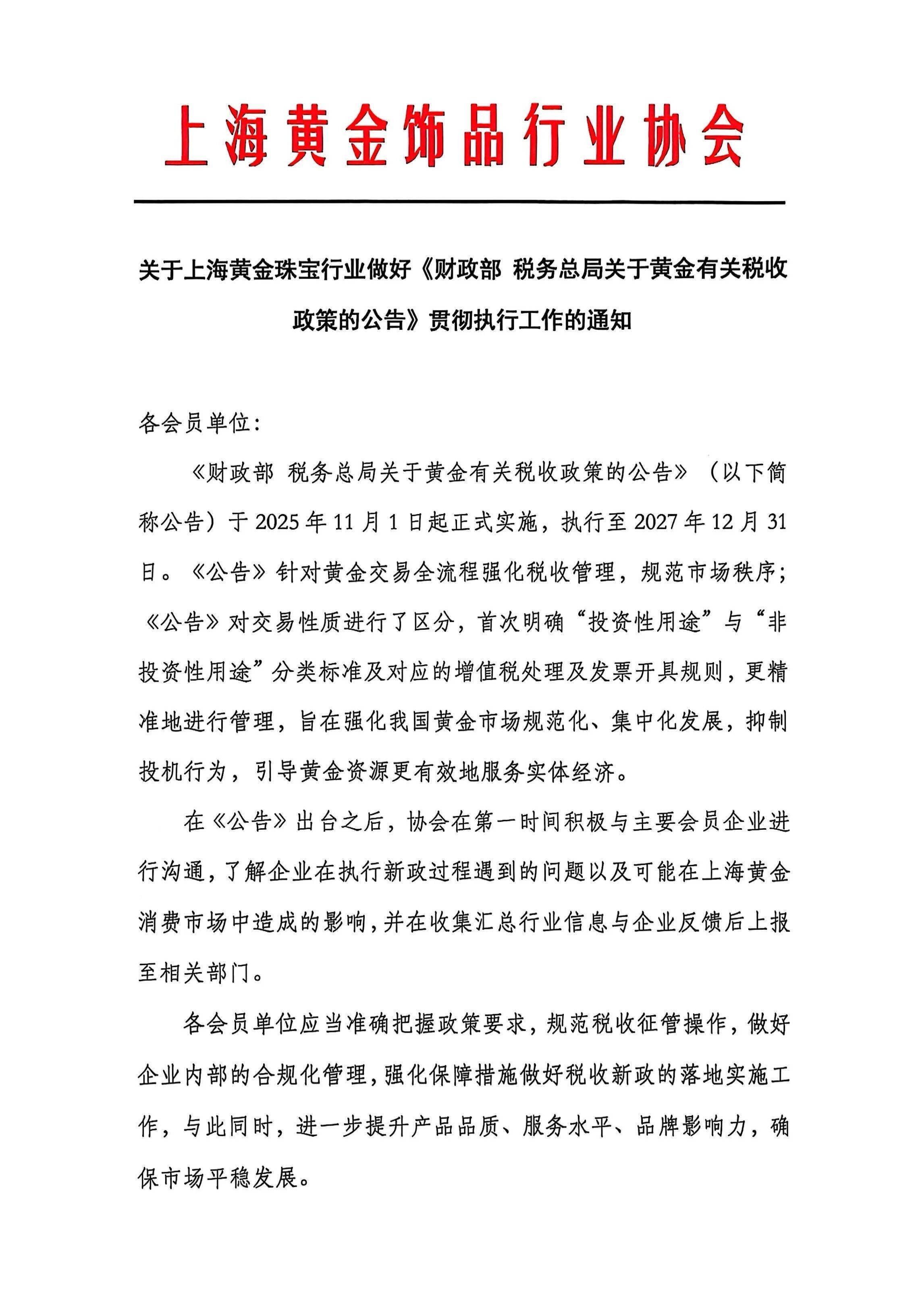 11月6日,上海黄金饰品行业协会发布关于上海黄金珠宝行业做好《财政部 税务总局关于黄金有关税收政策的公告》贯彻执行工作的通知。