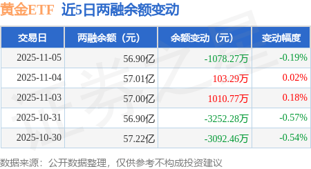 证券之星消息,11月5日,黄金ETF(159934)融资买入5508.95万元,融资偿还6587.22万元,融资净卖出1078.27万元,融资余额56.9亿元。