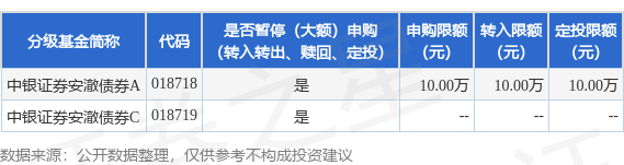 证券之星消息,11月6日中银国际证券股份有限公司发布《中银证券安澈债券型证券投资基金暂停大额申购、转换转入及定期定额投资业务的公告》。公告中提示,为保护基金份额持有人利益,自2025年11月6日起中银证券安澈债券型证券投资基金暂停大额申购、转换转入及定期定额投资业务,申购、转换转入上限金额为10.0万元,下属分级基金调整明细如下: