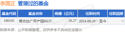 证券之星消息,2025年11月6日,易方达华威农贸市场REIT(180605)发布公告,增聘李国正为基金经理,任职日期自2025年11月6日起,变更后易方达华威农贸市场REIT(180605)的基金经理为戴旭,李国正,焦瑞鹏,雷昀。