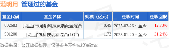 范明月女士:中国国籍,清华大学应用经济学硕士。自2012年8月至2021年5月任职于大家资产管理有限责任公司,先后担任研究员、周期制造组组长、权益投资经理;自2021年6月至2021年12月在泰康养老股份有限公司任股票投资总监;自2021年12月至2024年11月在大家资产管理有限责任公司任权益投资经理。2024年12月加入民生加银基金管理有限公司,2025年01月20日起任民生加银科技创新混合型证券投资基金(LOF)基金经理。2025年3月26日担任民生加银前沿科技灵活配置混合型证券投资基金基金经理。
