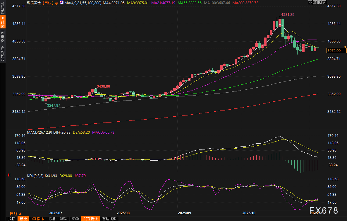 汇通财经APP讯——周四(11月6日)亚市早盘,现货一度跌破3970美元,最低触及3966美元,目前交投于3972美元/盎司附近,跌幅约0.15%,不过仍守住隔夜大部分涨幅。周三金价上涨1.2%,最高摸到3990.24美元,收盘3978.95美元,距离4000美元整数关仅一步之遥!因逢低买盘和避险买盘支撑金价,不过ADP就业数据强于市场预期,ISM非制造业PMI数据也表现强劲,市场对美联储12月降息预期降温,美元指数刷新近五个月高点,美债收益率大涨至近一个月高点,令多头有所顾忌。