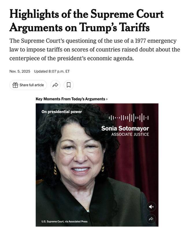 △据《纽约时报》报道,最高法院大法官对总统依据《国际紧急经济权力法》(IEEPA)在全球征收关税提出质疑