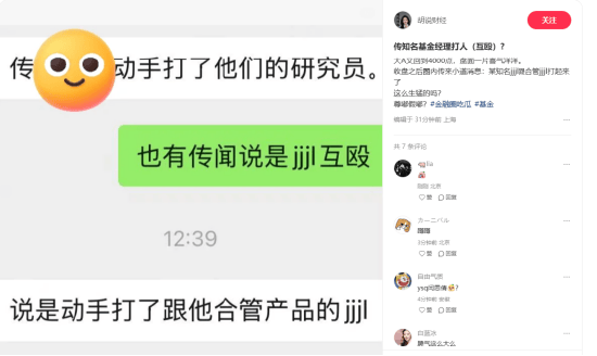 11月6日消息,网传近日鹏华基金旗下两位基金经理,闫思倩与王子建发生互殴。根据网传截图显示:闫思倩在办公室骂骂咧咧,王子建受不了了,去掐了他的脖子,然后严思倩正当防卫,拿烟灰缸或者瓶子,打了王子建的头,然后报警、送医院了。