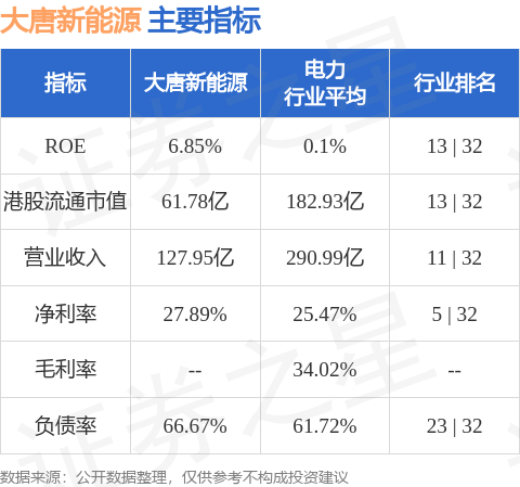 大唐新能源港股市值61.78亿港元,在电力行业中排名第13。主要指标见下表: