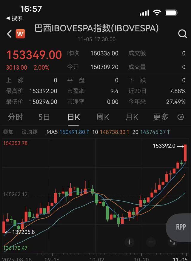分析人士认为,这首先得益于今年以来巴西股市的靓丽表现。据Wind显示,截至当地时间11月5日,巴西 IBOVESPA指数年内涨幅已高达27.49%,且该指数在近日连拉阳线,并创出了153392点的历史新高。