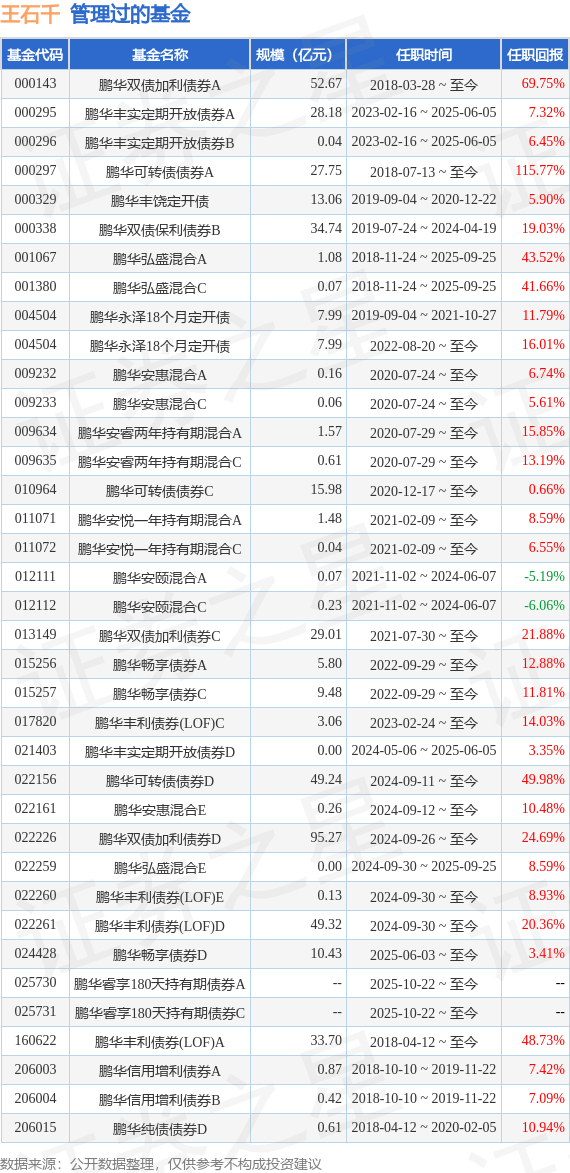 王石千先生:国籍中国,经济学硕士。2014年7月加盟鹏华基金管理有限公司,历任固定收益部高级债券研究员、债券投资一部基金经理、副总经理/基金经理。现担任多元资产投资部总经理/基金经理。2018年03月至今担任鹏华双债加利债券型证券投资基金基金经理,2018年04月至2020年02月担任鹏华纯债债券型证券投资基金基金经理,2018年04月至今担任鹏华丰利债券型证券投资基金(LOF)基金经理,2018年07月至今担任鹏华可转债债券型证券投资基金基金经理,2018年10月至2019年11月担任鹏华信用增利债券型证券投资基金基金经理,2018年11月至今担任鹏华弘盛灵活配置混合型证券投资基金基金经理,2019年07月至2024年04月担任鹏华双债保利债券型证券投资基金基金经理,2019年09月至2020年12月担任鹏华丰饶定期开放债券型证券投资基金基金经理,2019年09月至2021年10月担任鹏华永泽18个月定期开放债券型证券投资基金基金经理,2020年07月至今担任鹏华安惠混合型证券投资基金基金经理,2020年07月至今担任鹏华安睿两年持有期混合型证券投资基金基金经理,2021年02月至今担任鹏华安悦一年持有期混合型证券投资基金基金经理,2021年11月至2024年06月担任鹏华安颐混合型证券投资基金基金经理,2022年08月至今担任鹏华永泽18个月定期开放债券型证券投资基金基金经理,2022年09月至今担任鹏华畅享债券型证券投资基金基金经理,2023年02月至今担任鹏华丰实定期开放债券型证券投资基金基金经理,王石千先生具备基金从业资格。