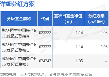 证券之星消息,11月7日发布《鹏华基金管理有限公司关于鹏华恒生中国央企交易型开放式指数证券投资基金发起式联接基金2025年第5次分红公告》。本次分红为2025年第5次分红。公告显示,本次分红的收益分配基准日为10月10日,详细分红方案如下: