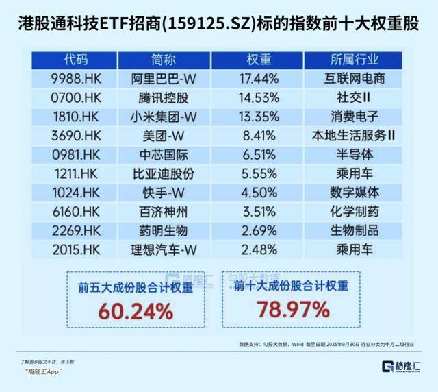以聚焦硬科技和新经济的国证港股通科技指数为例,前十大成份股包括腾讯控股、小米集团、阿里巴巴、美团、中芯国际、比亚迪股份、百济神州等各个细分领域“尖子生”,权重合计79%,集中度高。