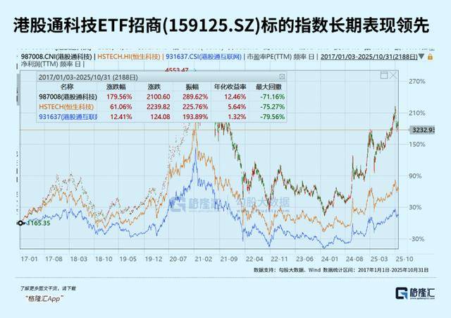 Wind数据显示,自2017年以来至2025年10月31日,国证港股通科技指数累计涨幅179.56%,同期港股通互联网、恒生科技指数涨幅12.41%、61.06%,显示出较强的成长弹性。