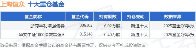 根据2025基金Q3季报公募基金重仓股数据,重仓该股的公募基金共2家,其中持有数量最多的公募基金为浙商基金的浙商丰利增强债券。浙商丰利增强债券目前规模为8.86亿元,最新净值1.8072(11月6日),较上一交易日上涨0.78%,近一年上涨11.77%。该公募基金现任基金经理为赵柳燕 黄玥 饶祖华。赵柳燕在任的基金产品包括:浙商日添利A,管理时间为2020年9月8日至今,期间收益率为8.79%;浙商日添金货币A,管理时间为2020年10月12日至今,期间收益率为9.91%;浙商中短债A,管理时间为2020年10月12日至今,期间收益率为17.03%;浙商惠隆39个月定开债券,管理时间为2020年10月12日至今,期间收益率为16.74%。饶祖华在任的基金产品包括:浙商中证500增强A,管理时间为2025年8月25日至今,期间收益率为4.97%;浙商智多盈债券A,管理时间为2025年8月25日至今,期间收益率为0.62%;浙商中证1000指数增强A,管理时间为2025年8月25日至今,期间收益率为1.64%。黄玥在任的基金产品包括:浙商智多盈债券A,管理时间为2024年12月16日至今,期间收益率为3.08%;浙商惠裕纯债A,管理时间为2025年2月27日至今,期间收益率为1.54%;浙商丰顺纯债债券,管理时间为2025年2月27日至今,期间收益率为1.34%;