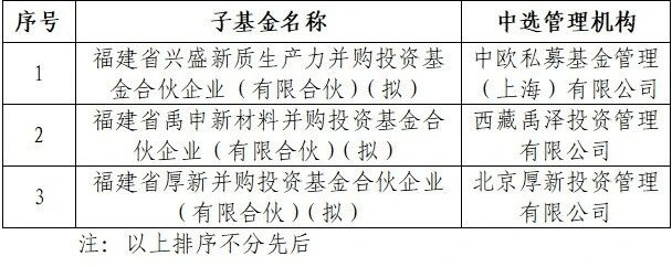 为深入贯彻《国务院办公厅关于促进政府投资基金高质量发展的指导意见》(国办发〔2025〕1号)精神,认真落实《福建省人民政府办公厅关于进一步推动资本市场服务科技型企业高质量发展的若干措施》(闽政办〔2025〕9号)相关要求,福建金投拟投资设立福建省新质生产力并购系列子基金,现将3只子基金(第一批)管理机构遴选结果公示如下: