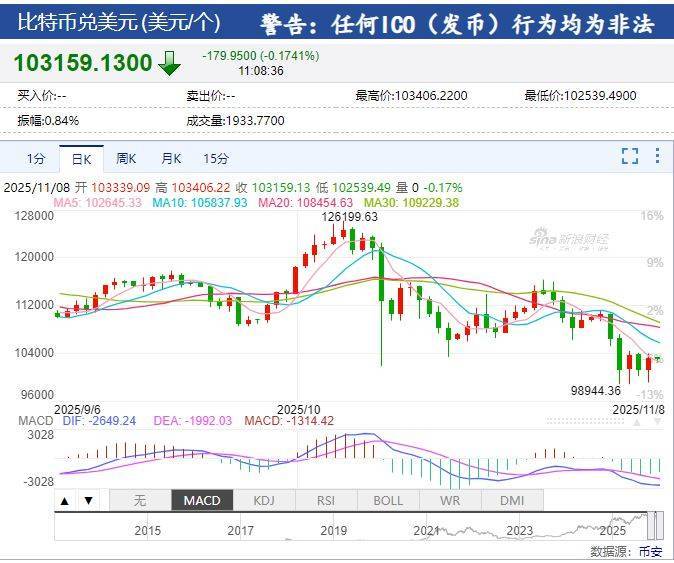 在经历了一周的下跌后,比特币价格在当地时间11月7日尾盘企稳反弹,价格回升至10.3万美元上方,但仍较10月6日创下的12万美元纪录高点下跌约18%。