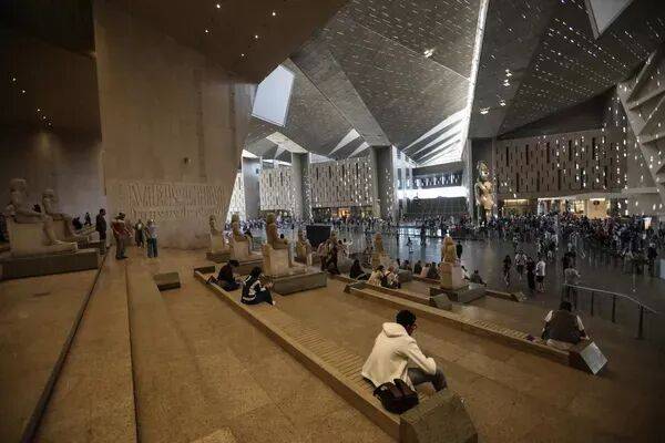 3/8 游客们在游览大埃及博物馆期间休息。