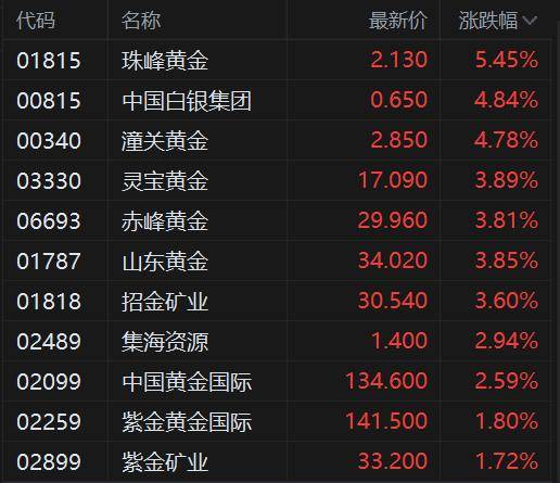 港股黄金股普遍拉升上涨,其中,珠峰黄金涨5.5%,潼关黄金涨约5%,灵宝黄金、赤峰黄金、山东黄金、招金矿业均涨近4%,中国黄金国际、紫金黄金国际、紫金矿业跟涨。