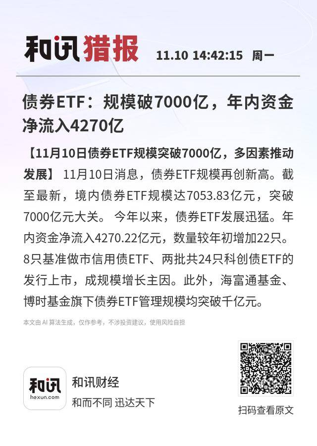 【11月10日债券ETF规模突破7000亿,多因素推动发展】11月10日消息,债券ETF规模再创新高。截至最新,境内债券ETF规模达7053.83亿元,突破7000亿元大关。今年以来,债券ETF发展迅猛。年内资金净流入4270.22亿元,数量较年初增加22只。8只基准做市信用债ETF、两批共24只科创债ETF的发行上市,成规模增长主因。此外,海富通基金、博时基金旗下债券ETF管理规模均突破千亿元。
