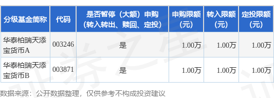 证券之星消息,11月11日华泰柏瑞基金管理有限公司发布《华泰柏瑞天添宝货币市场基金调整机构投资者大额申购及大额转换转入业务金额限制的公告》。公告中提示,为保证本基金的稳定运作,保护基金份额持有人利益,自2025年11月12日起华泰柏瑞天添宝货币市场基金调整机构投资者大额申购及大额转换转入业务金额限制,申购、转换转入上限金额为1.0万元,下属分级基金调整明细如下: