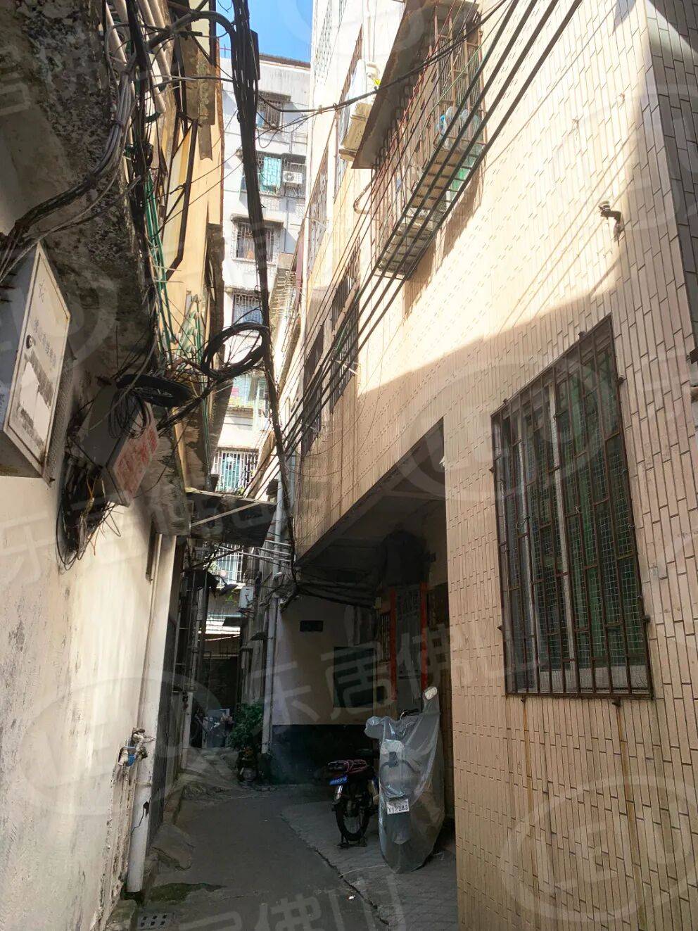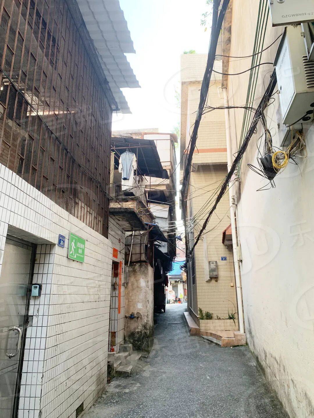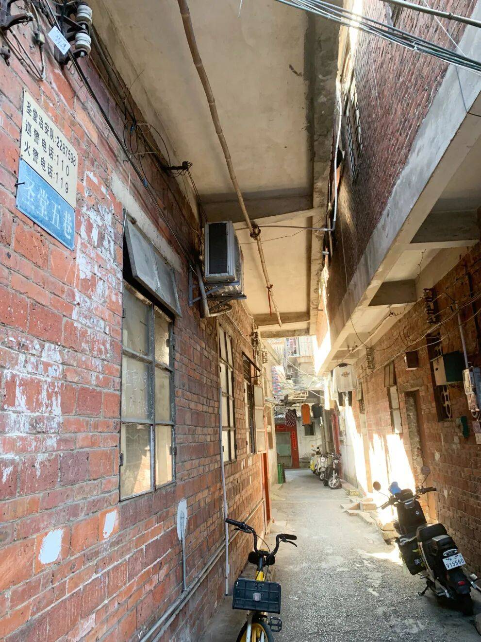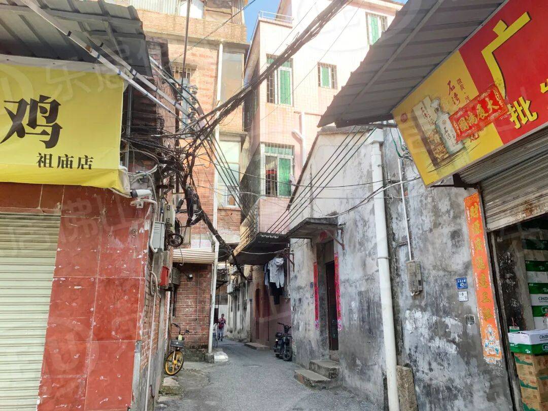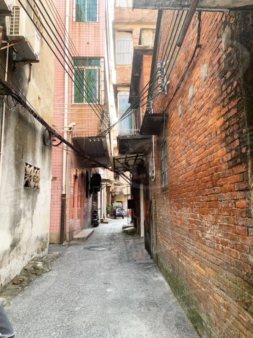 村内多为破旧的红砖民房与逼仄的握手楼,道路拥挤且不规则,电线杂乱无章。