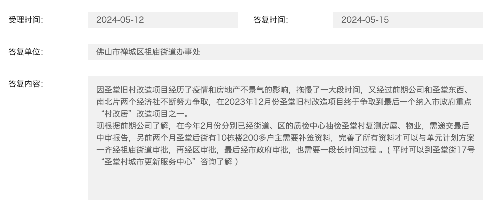 去年5月,祖庙街道办事处回复相关咨询指出,因圣堂旧村改造项目经历了疫情和房地产不景气的影响,拖慢了一大段时间,又经过前期公司和圣堂东西、南北片两个经济社不断努力争取,在2023年12月份圣堂旧村改造项目终于争取到最后一个纳入市政府重点“村改居”改造项目之一。