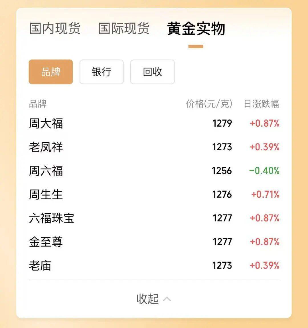 目前,多个品牌黄金实物价格超过1270元/克。