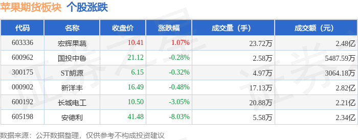 证券之星消息,11月11日苹果期货板块较上一交易日下跌2.32%,安德利领跌。当日上证指数报收于4002.76,下跌0.39%。深证成指报收于13289.0,下跌1.03%。苹果期货板块个股涨跌见下表: