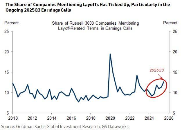 高盛开发了新工具,通过追踪上市公司财报电话会议记录来监测裁员讨论情况。该工具显示,聚焦裁员的讨论近期有所增加,特别是在当前进行的2025年第三季度财报电话会议中。研究发现,在企业多次讨论人工智能后,裁员相关讨论便会增加,尽管这一模式在非科技公司中刚刚开始显现。