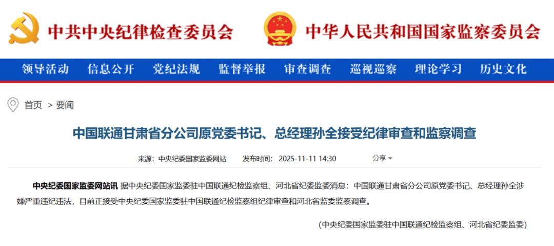 据中央纪委国家监委驻中国联通纪检监察组、河北省纪委监委消息:中国联通甘肃省分公司原党委书记、总经理孙全涉嫌严重违纪违法,目前正接受中央纪委国家监委驻中国联通纪检监察组纪律审查和河北省监委监察调查。