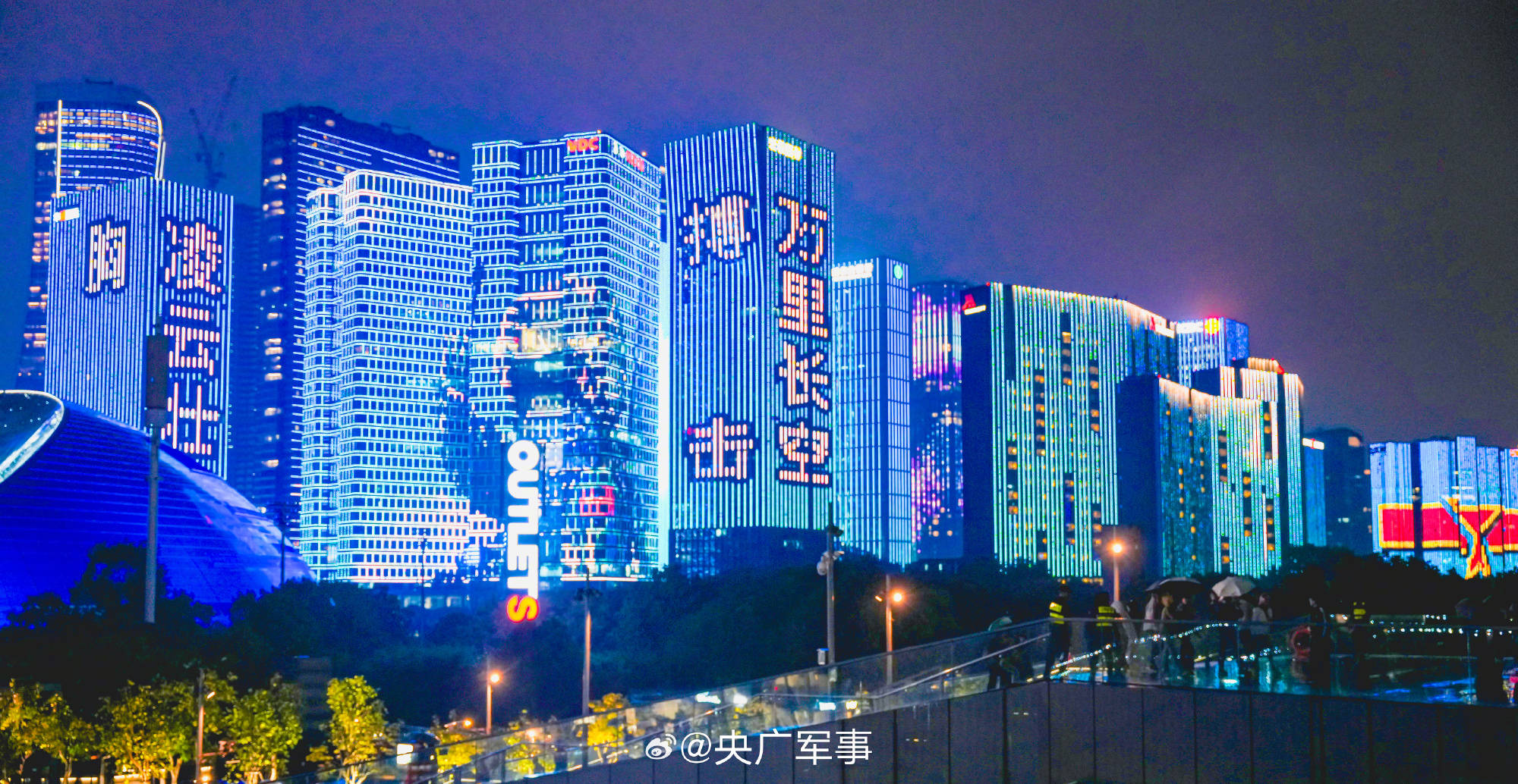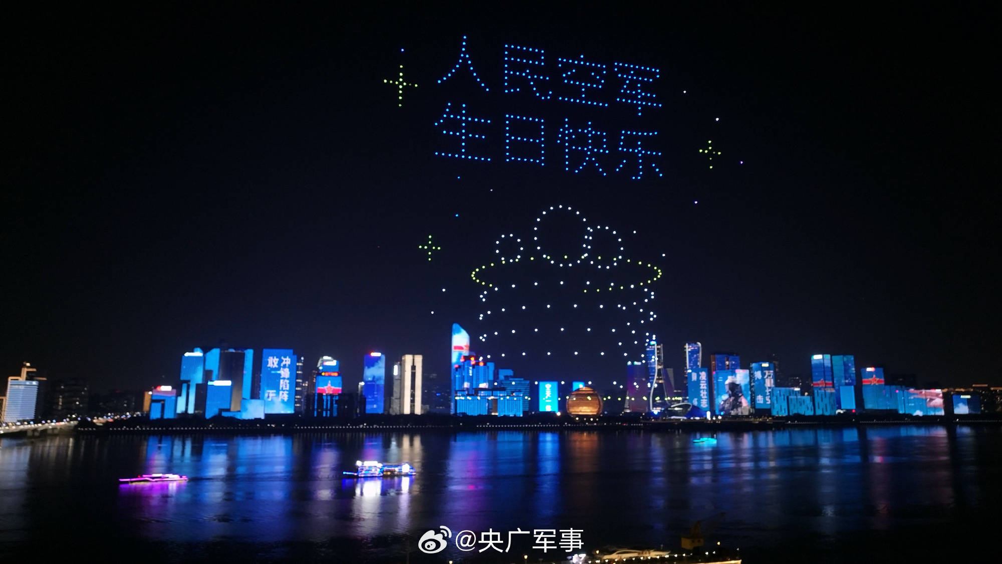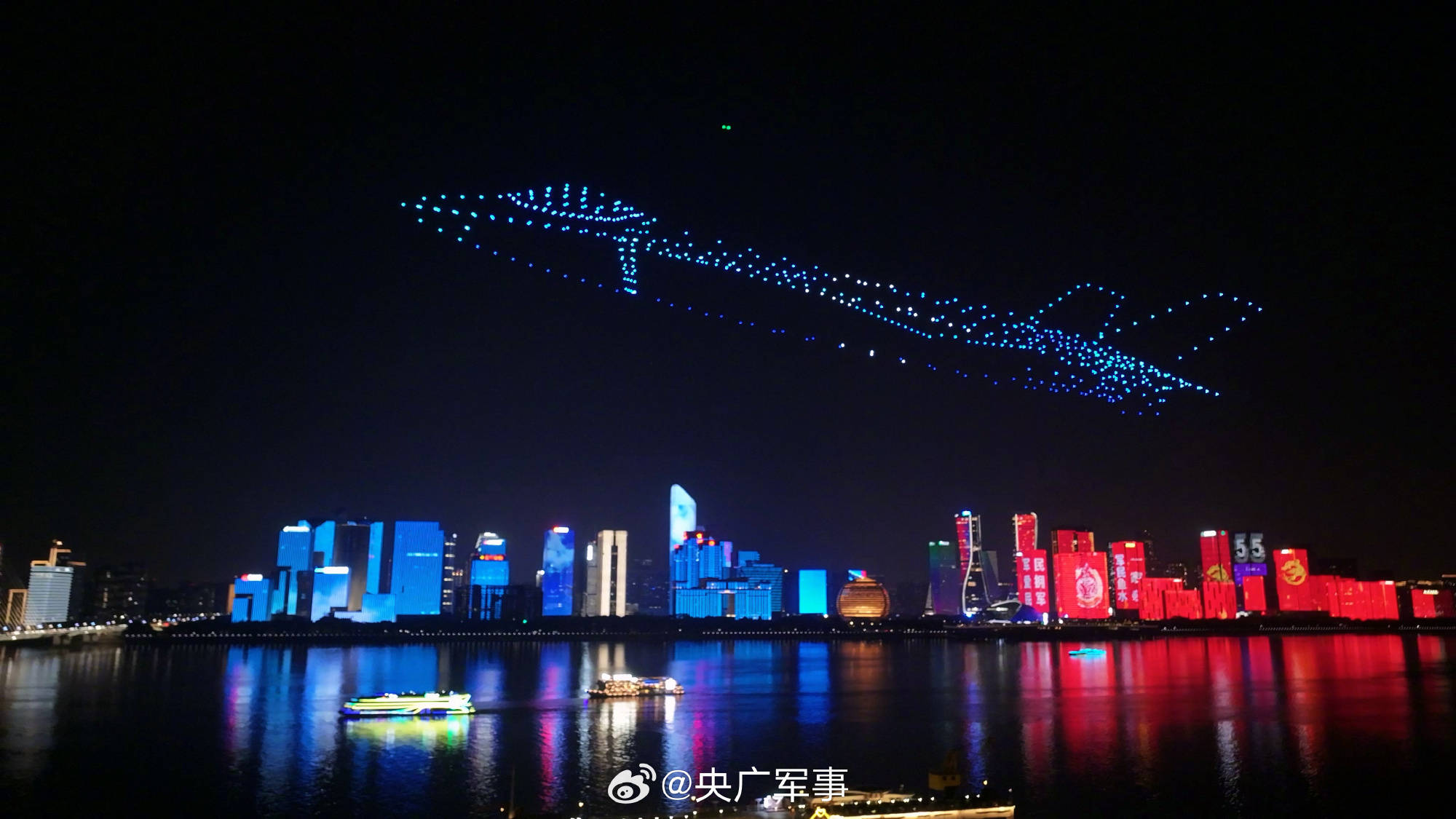 11月8日至11日,浙江杭州,以“庆祝人民空军成立76周年”为主题的灯光秀与无人机表演精彩上演,“威龙”“鲲鹏”“人民空军生日快乐”等图案和字样在夜色中熠熠生辉。来源:央广军事(刘博)
