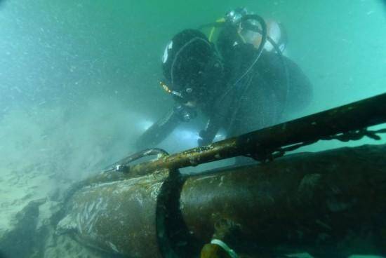 水下考古队员在山东威海湾来远舰遗址进行抽沙作业(资料照片)。新华社发