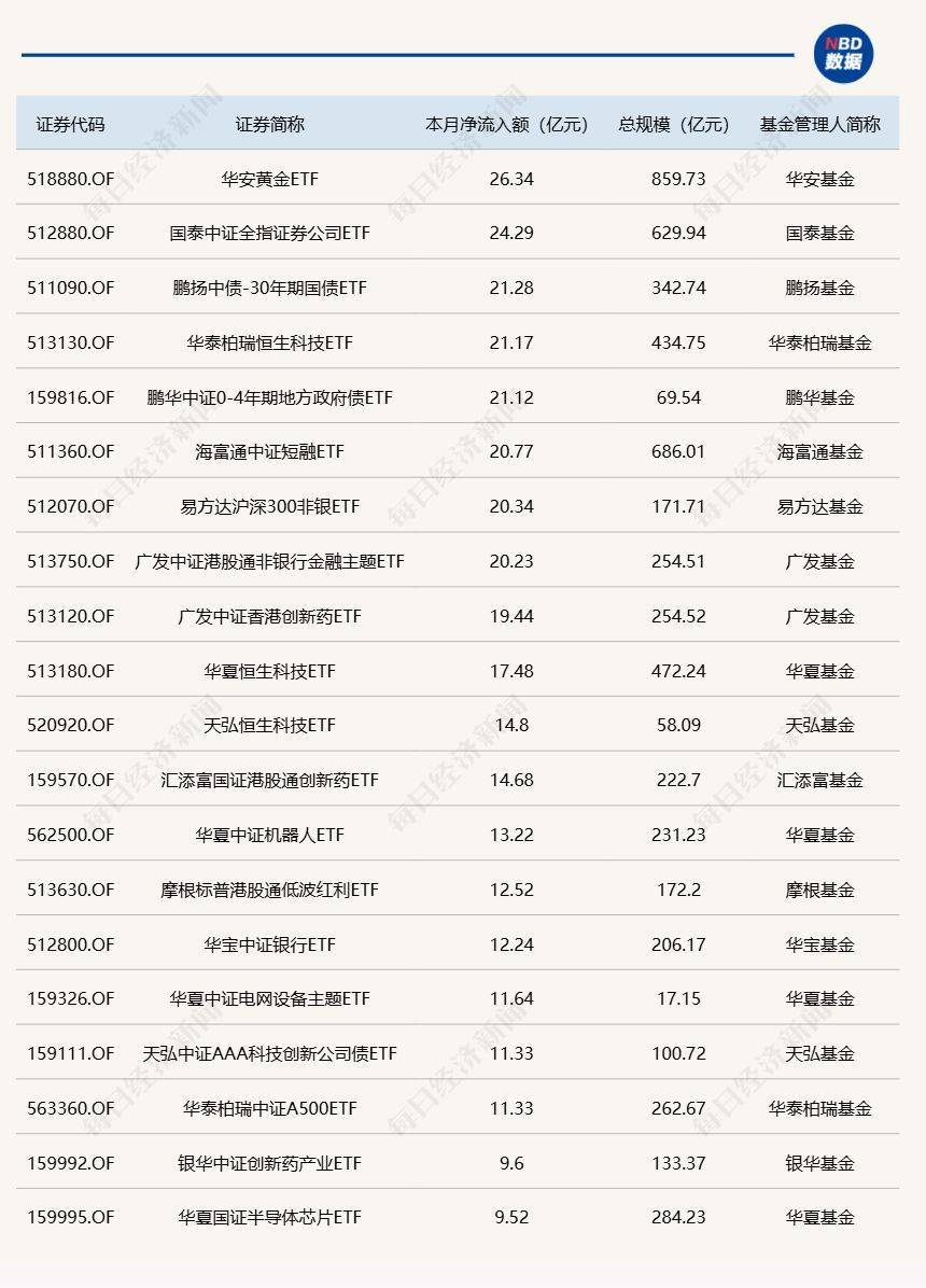 截至11月12日,本月资金净流入额居前20的ETF名单如下: