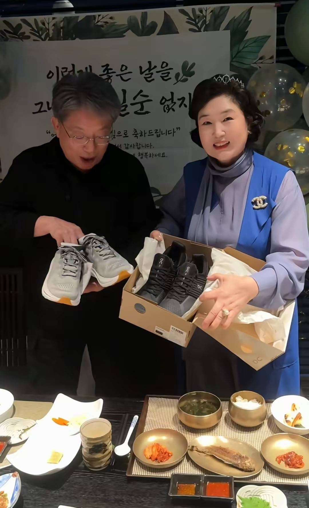 最有趣的就是送礼物的环节了,李多海的父母也来给亲家祝寿,他们给李多海的公婆一人送了一双鞋子,很轻便的运动鞋、老年人也爱穿。