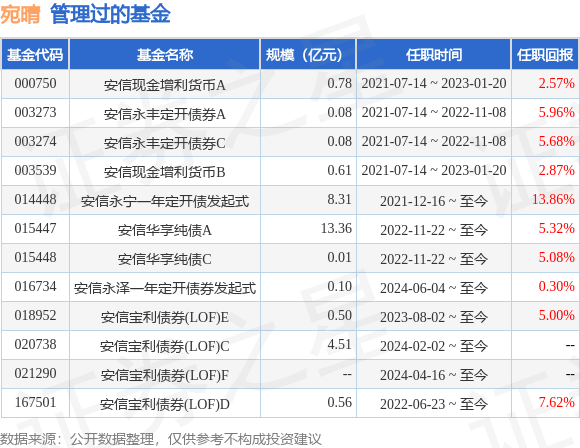 宛晴女士:中国国籍,工商管理硕士,毕业于中国科学院大学,获得MBA学位。历任东兴证券股份有限公司资产管理业务总部交易员、交易主管、投资经理助理,现任安信基金管理有限责任公司固定收益部基金经理。2021年07月14日至2022年11月07日,任安信永丰定期开放债券型证券投资基金的基金经理;2021年07月14日至2023年01月19日,任安信现金增利货币市场基金的基金经理;2022年06月23日至今,任安信宝利债券型证券投资基金(LOF)(原安信宝利分级债券型证券投资基金)的基金经理;2022年11月22日至今,任安信华享纯债债券型证券投资基金的基金经理。2024年06月04日至今,任安信永泽一年定期开放债券型发起式证券投资基金基金经理。2024年7月8日至今,任安信60天滚动持有债券型证券投资基金基金经理。曾任安信永宁一年定期开放债券型发起式证券投资基金的基金经理。