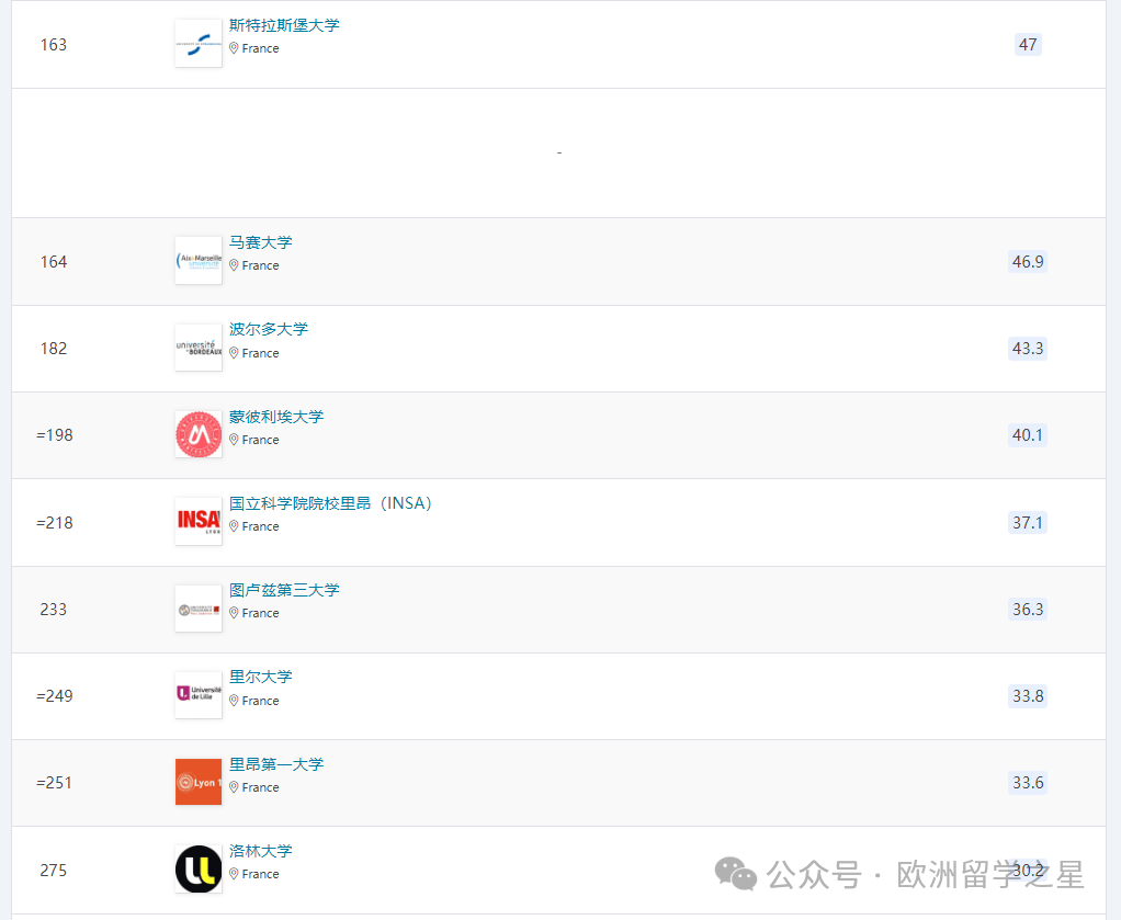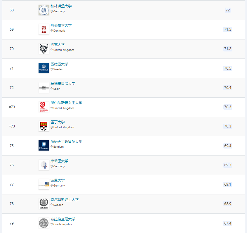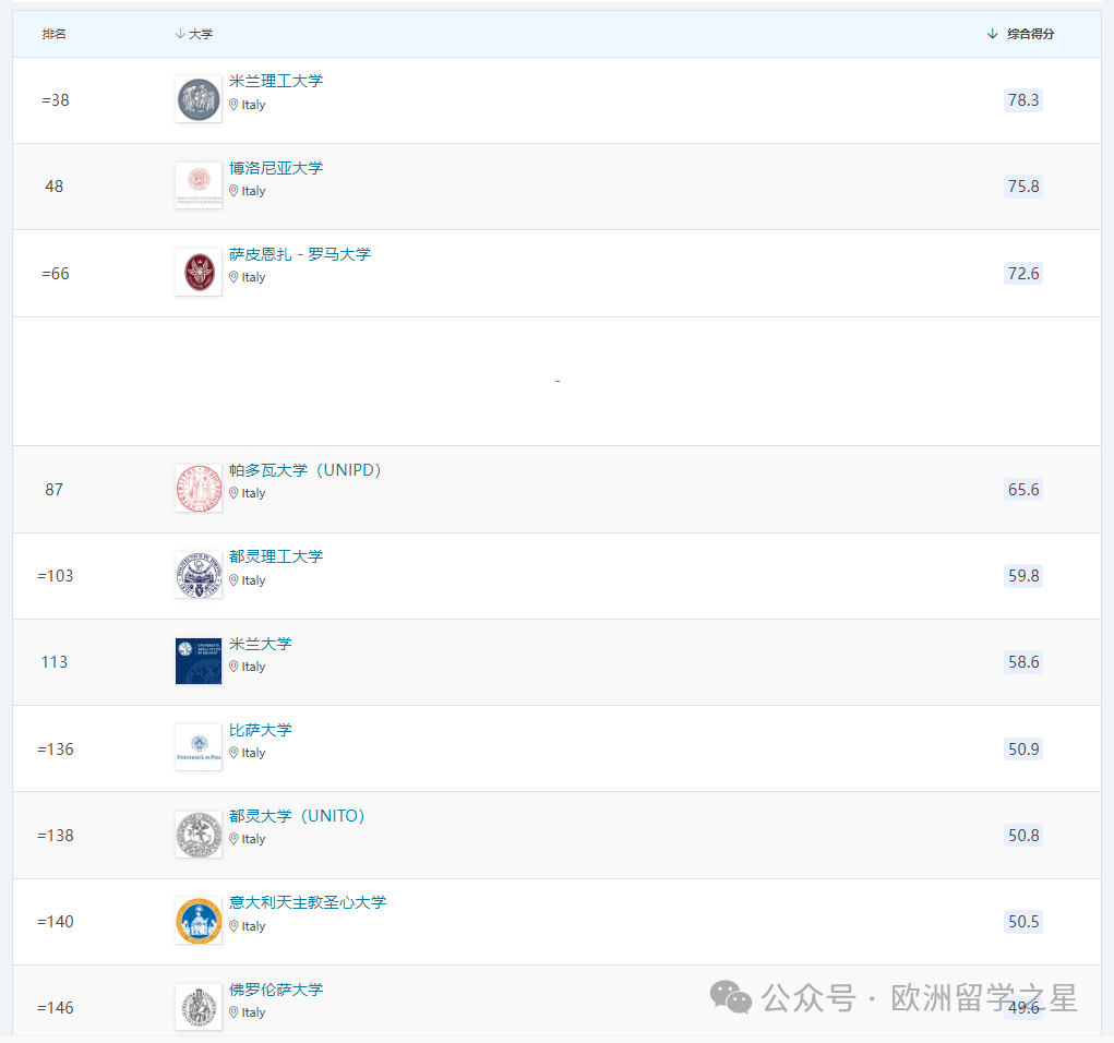 意大利此次入围数量为47,其中4所高校进入欧洲Top100,排名最高的是米兰理工大学,为欧洲第38名。