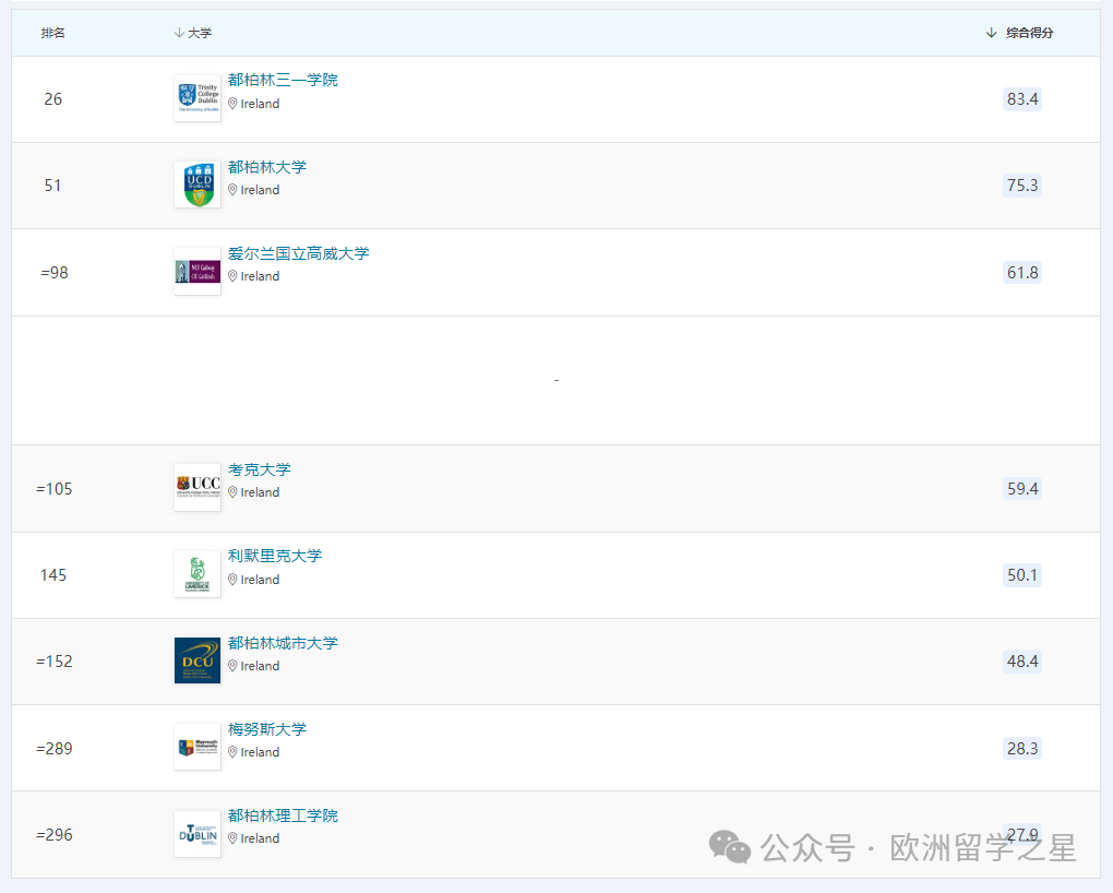 爱尔兰8所大学上榜,3所大学欧洲排名前100,分别是都柏林圣三一学院欧洲排名第26、都柏林大学欧洲排名第51、高威大学欧洲排名并列第98.