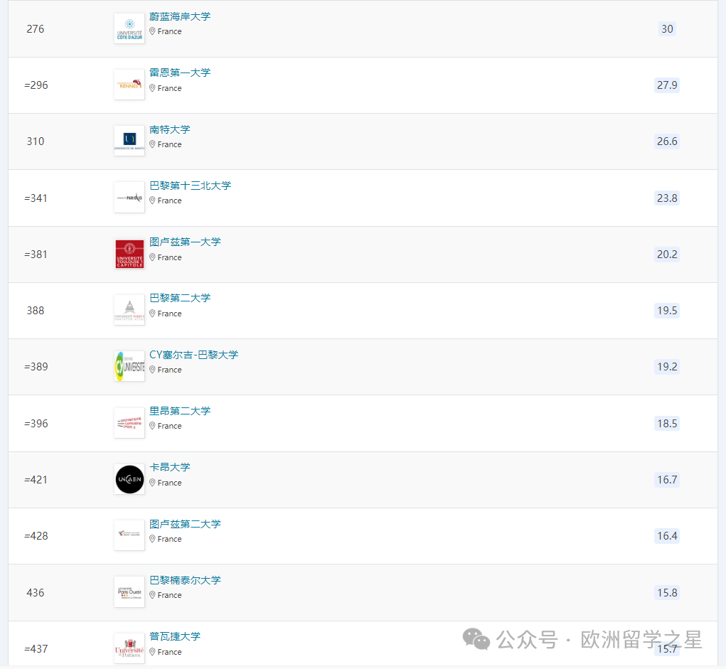 法国有38所高校上榜,其中4所进入欧洲前100,包括巴黎科学艺术人文大学(第9)、巴黎理工学院(第23)、巴黎萨克雷大学(第30)和索邦大学(第31)。