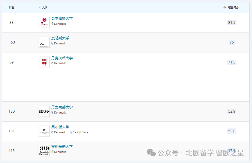 丹麦6所大学上榜,3所大学欧洲排名前100,分别是哥本哈根大学欧洲排名第33位、奥胡斯大学欧洲排名并列第53位、丹麦技术大学欧洲排名第69位。