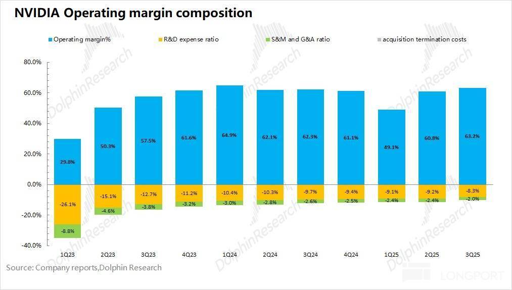 2026 财年第三季度英伟达核心经营利润率为 63.2%,继续提升,主要是受毛利率回升以及经营费用率下降的影响。