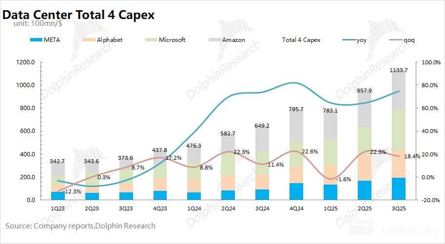当前云服务厂商依然是公司 AI 芯片的最大购买方,因而下游云厂商的资本投入构成了公司数据中心业务增长的基础。而通过四家公司(谷歌、Meta、微软和亚马逊)的管理层交流,海豚君预期四大厂商在 2026 年的资本开支有望达到将近 5900 亿美元,同比增长 42%,这也为公司明年业绩高增长带来了保障。