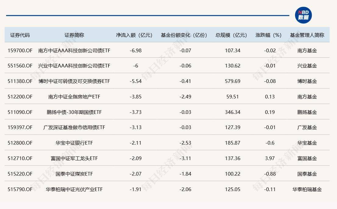 与此同时,南方中证AAA科技创新公司债ETF基金份额减少0.07亿份,对应资金净流出6.98亿元;兴业中证AAA科技创新公司债ETF份额减少0.06亿份,出现净流出6.00亿元;博时中证可转债及可交换债券ETF份额减少0.41亿份,录得净流出5.54亿元。