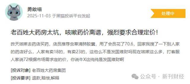 在黑猫投诉平台上,关于老百姓大药房的投诉已有200多起,其中不乏关于药品售价畸高的投诉。一位患者在店员推荐下购买了虫草清肺胶囊,会员价70多,而后发现别家才卖20左右,溢价3倍有余;另一位患者购买的健胃消食片,也比京东大药房和江中自营店的贵了大约1倍。