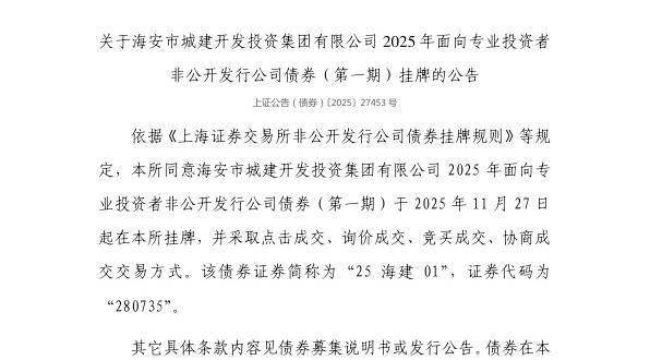 11月26日,上交所发布关于海安市城建开发投资集团有限公司2025年面向专业投资者非公开发行公司债券(第一期)挂牌的公告。