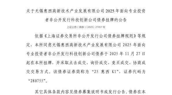 依据《上海证券交易所非公开发行公司债券挂牌规则》等规定,上交所同意无锡惠西高新技术产业发展有限公司2025年面向专业投资者非公开发行科技创新公司债券于2025年11月27日起在上交所挂牌,并采取点击成交、询价成交、竞买成交、协商成交交易方式。该债券证券简称为“25惠西K1”,证券代码为“280755”。