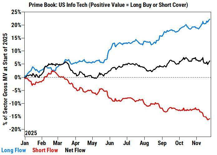 上周四对冲基金还在大举抛售美国科技股,但周五和周一立即转为买家。买入活动主要由多头建仓推动,空头回补为辅,两者比例约为4:1。