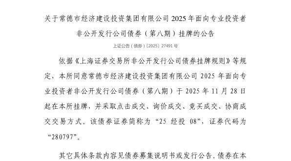 依据《上海证券交易所非公开发行公司债券挂牌规则》等规定,上交所同意常德市经济建设投资集团有限公司2025年面向专业投资者非公开发行公司债券(第八期)于2025年11月28日起在上交所挂牌,并采取点击成交、询价成交、竞买成交、协商成交交易方式。该债券证券简称为“25经投08”,证券代码为“280797”。